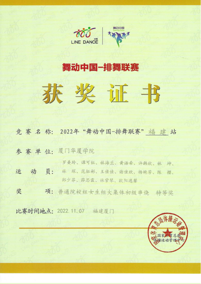 近日,由国家体育总局体操运动管理中心、中国蹦床与技巧协会主办的2022 年“舞动中国—排舞联赛”(福建站)线上比赛顺利收官。经过精彩激烈的角逐,我校排舞代表队(罗美玲、谭可钰、林海兰、黄语希、许韩欣、林坤、林琛、范钰彬、王佳佳、谢佳欣、杨艳芳、陈樱、郑少芬、薛思霖、林紫琴、欧阳逸馨)获得普通院校组女生组大集体初级串烧和大集体自选舞台两项特等奖,袁文丽获得“优秀教练员”荣誉称号。