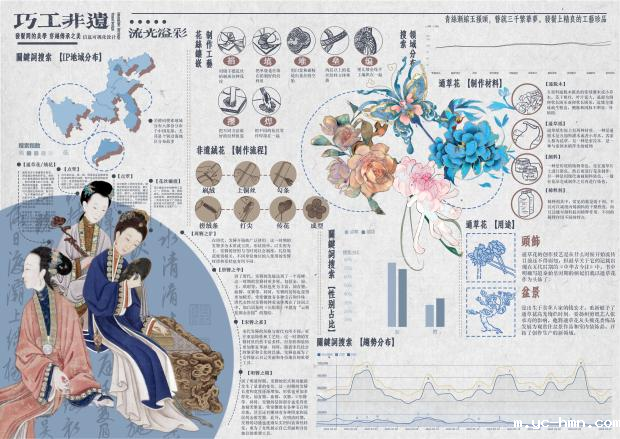 2、魏东翰、林志鹏、蔡琳同学作品《千年非遗鬓上奇缘》,本作品以中国传统文化非遗传承———花丝镶嵌、点翠、绒花、通草花为源。背景以纯白色为底,四张海报以四种不同的非遗为主体,蕴含了浓厚的古韵和传统文化非遗的风采。文字排版以简约为主,更具有现代感,把非遗的时代感与现代海报的时尚感融合在一起。每张海报也在排版上对4种非遗进行了介绍,这也是对中国非遗的一种宣传。在这个快节奏的时代,我们常常忽略了我们身后那些沉甸甸的文化底蕴。中国非物质文化遗产,就是这些文化瑰宝中最闪耀的一颗星,代表着中华民族几千年来的文化积淀,是中华民族的骄傲和自豪。