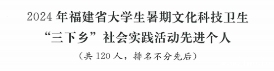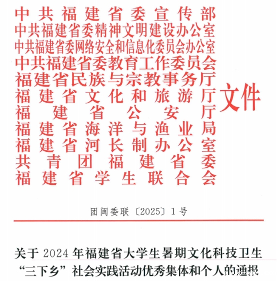近日,中共福建省委宣传部、中共福建省委文明办、中共福建省委教育工委、福建省河长制办公室、共青团福建省委、福建省学生联合会等部门联合发布《关于2024年福建省大学生暑期文化科技卫生“三下乡”社会实践活动优秀集体和个人的通报》,通报表扬了表现优异的30个省级先进单位、60个省级优秀团队、120名省级先进工作者、120名省级先进个人,我校信息与智能机电团委副书记成越获“省级先进工作者”、人文学院2022级环境设计专业邹家豪获“省级先进个人”。